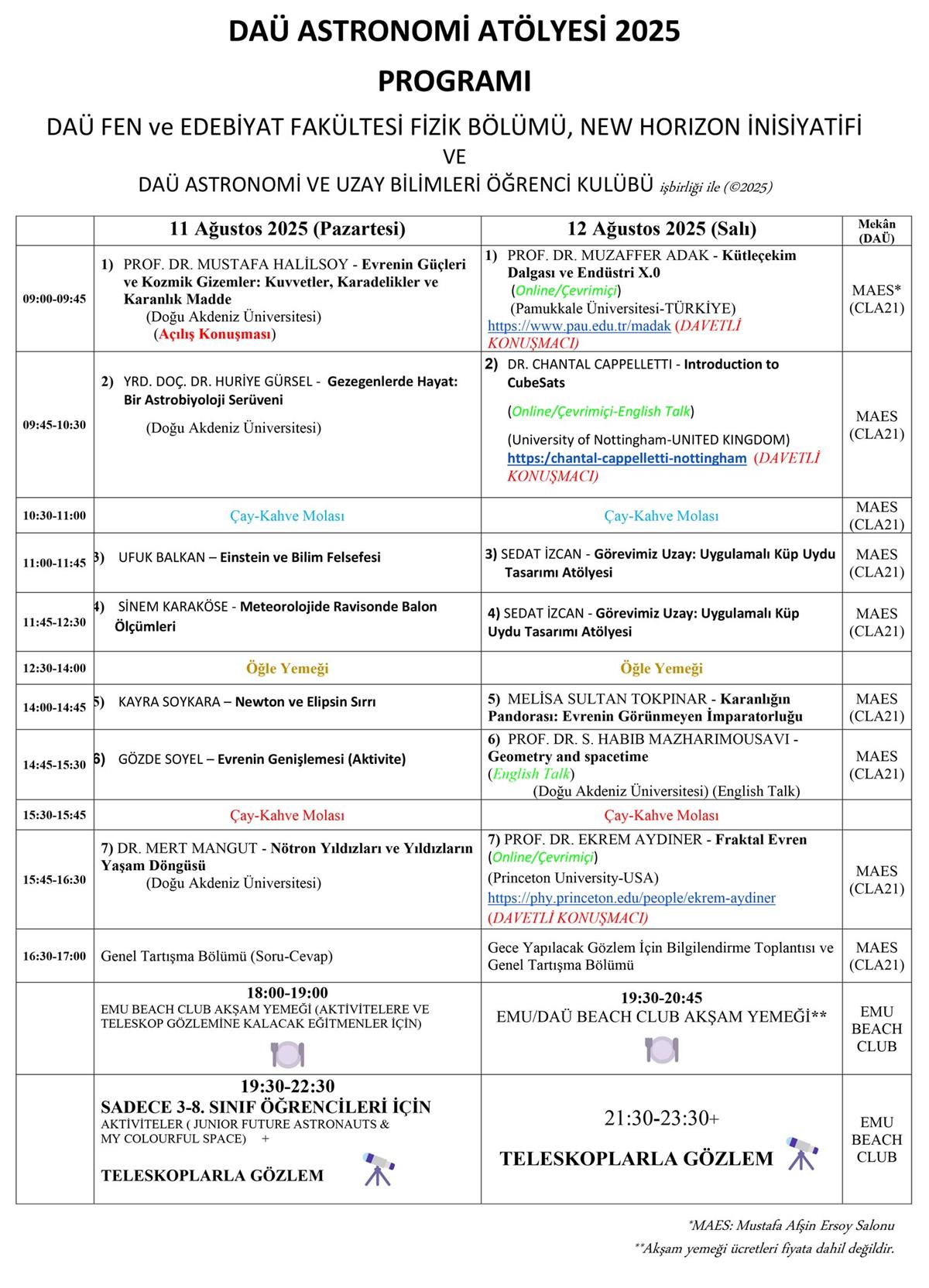 • 2 günlük (11-12 Ağustos 2025) DAÜ Astronomi atölyesi sertifikalı eğitim 3500 TL (*Ücrete DAÜ Tabldot Restaurantta öğle yemekleri dahil olup, çay-kahve molaları ve servisler dahildir.) The 2-day (August 11–12, 2025) EMU Astronomy Workshop with certificate: 3500 TL